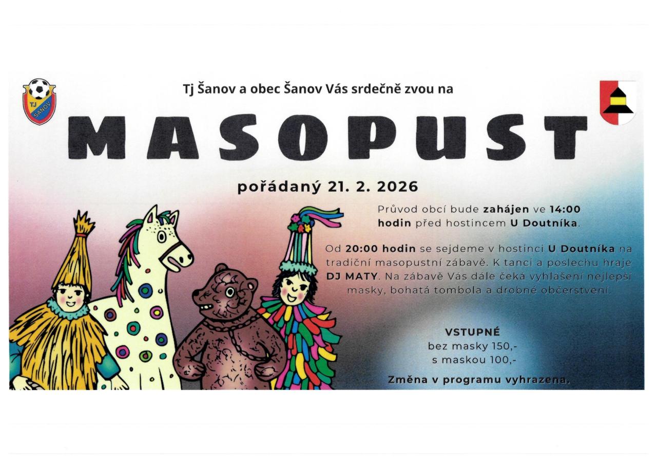 Srdečně zveme na průvod obcí, který bude zahájen ve 14 hod. před hostincem "U Doutníka". Od 20 hod. se sejdeme na tradiční masopustní zábavě. k tanci a poslechu hraje DJ MATY.